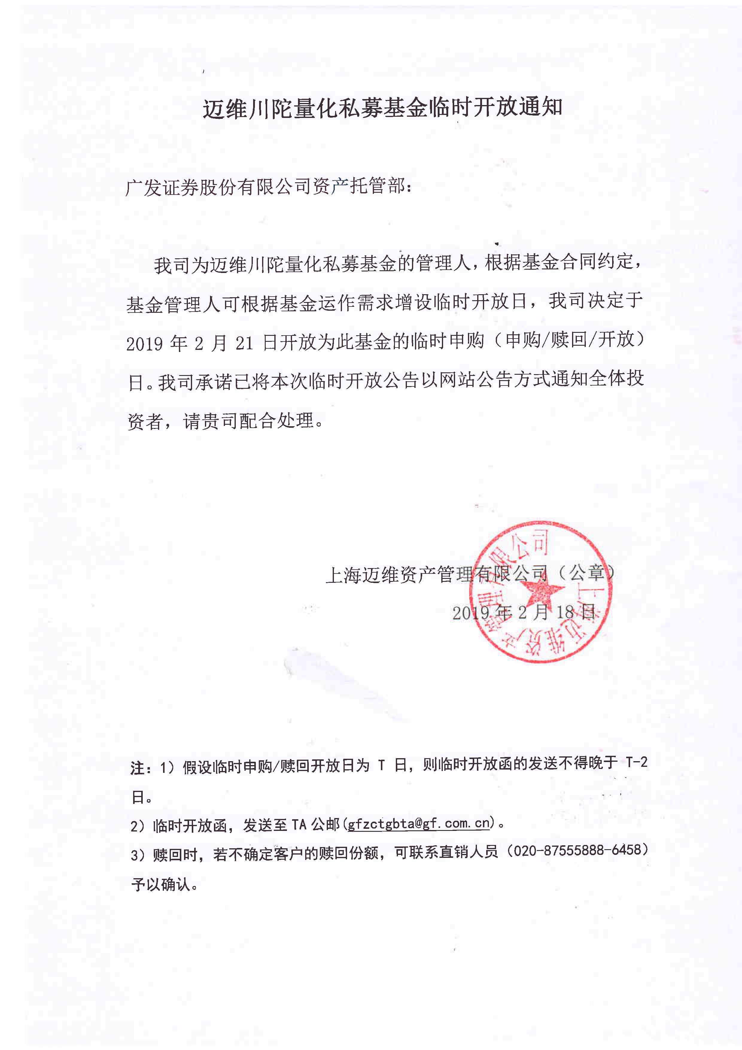 迈维川陀量化私募基金临时开放通知
